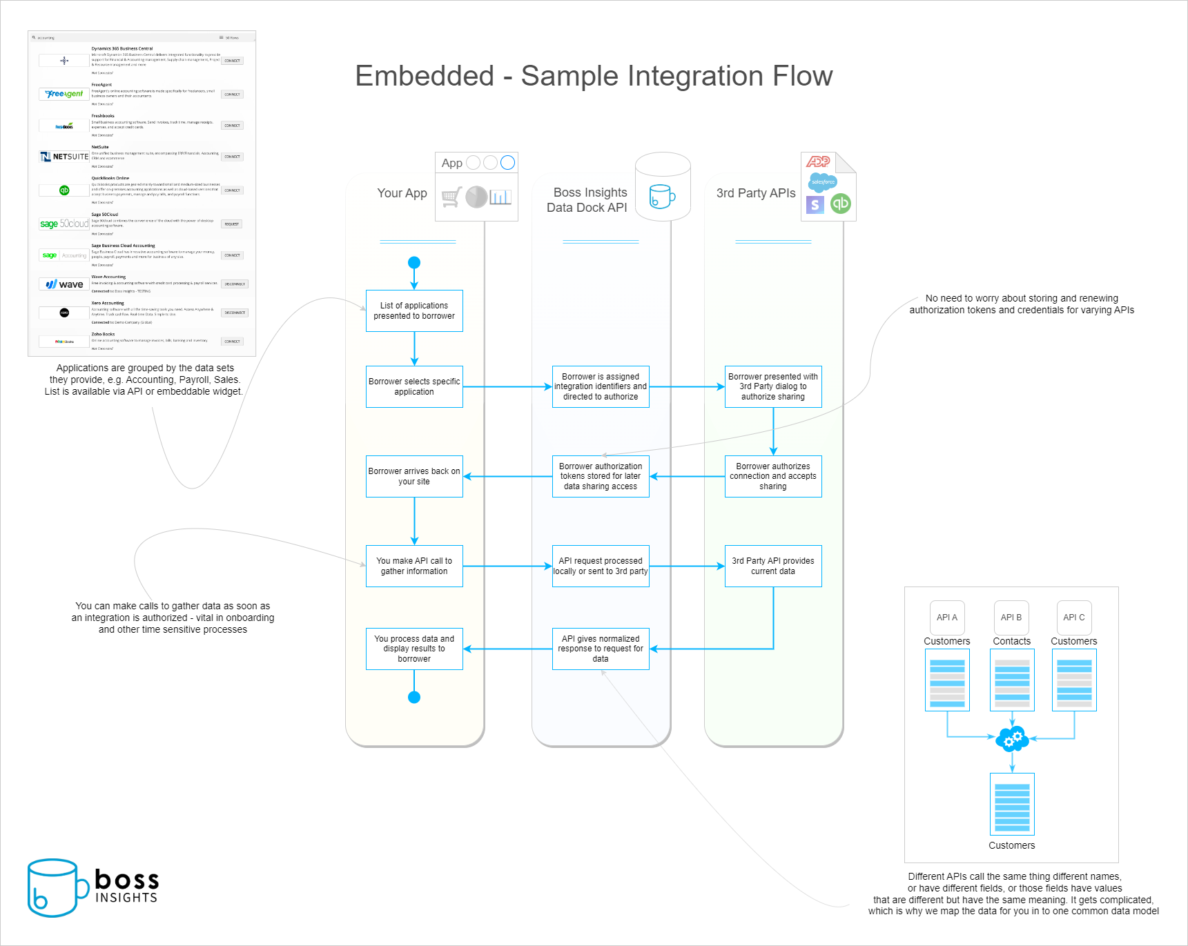 To connect a customer's business application software you first need to get their permission to access their account by connecting the App. Once the App is connected you can make subsequent API calls to gather data.