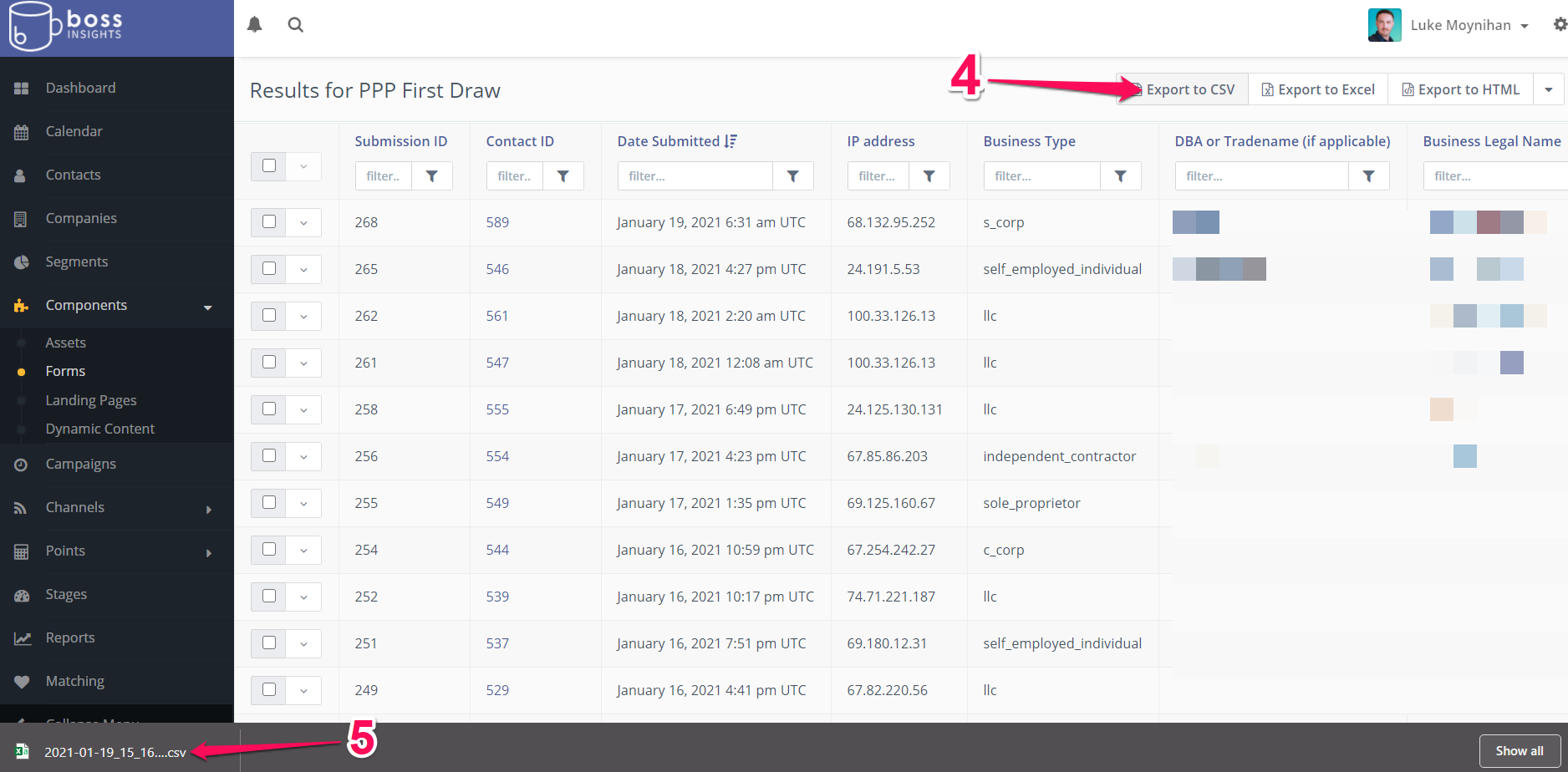 Click on “Components”, then ”Forms” in the side menu. Click the blue “View n Results” button for the form you would like to export.