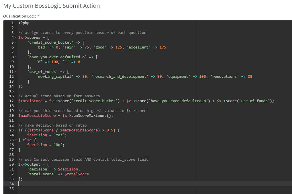 The Qualification Logic code editor in the My Custom BossLogic Submit Action pop-up accepts PHP code. The code must start with the PHP opening tag <?php. The code has access to a class instance under the variable name $x. The $x object contains the values of the recently completed form. The goal of your Qualification Logic code is to set an array on the $x->output property to modify Contact fields.