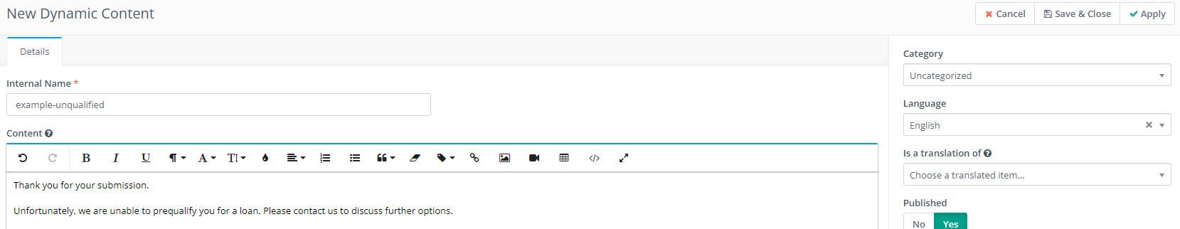 2. Fill in the Internal Name field and fill in the Content section with what you would like to display to a qualified form submitter.